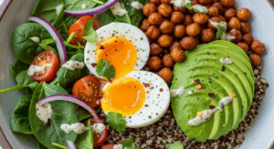 This bright bowl pairs wonderfully with a refreshing green smoothie or a cup of herbal tea to balance its hearty richness. For a colorful presentation, garnish with edible flowers or a sprinkle of toasted pumpkin seeds for extra crunch.Serve on vibrant ceramic bowls that highlight the avocado’s verdant green and the eggs’ golden yolks, making every meal an Instagram-worthy fuel session.